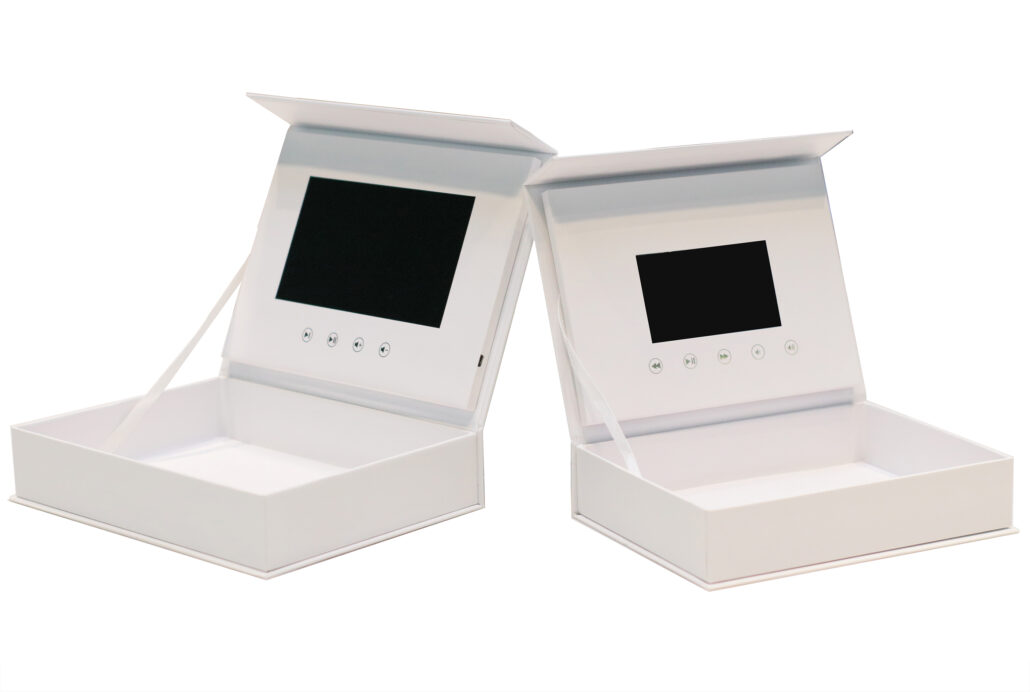 Voice-Activated Video Boxes: When opened, a previewed box plays customized welcome messages, ideal for trade show lead follow-ups.